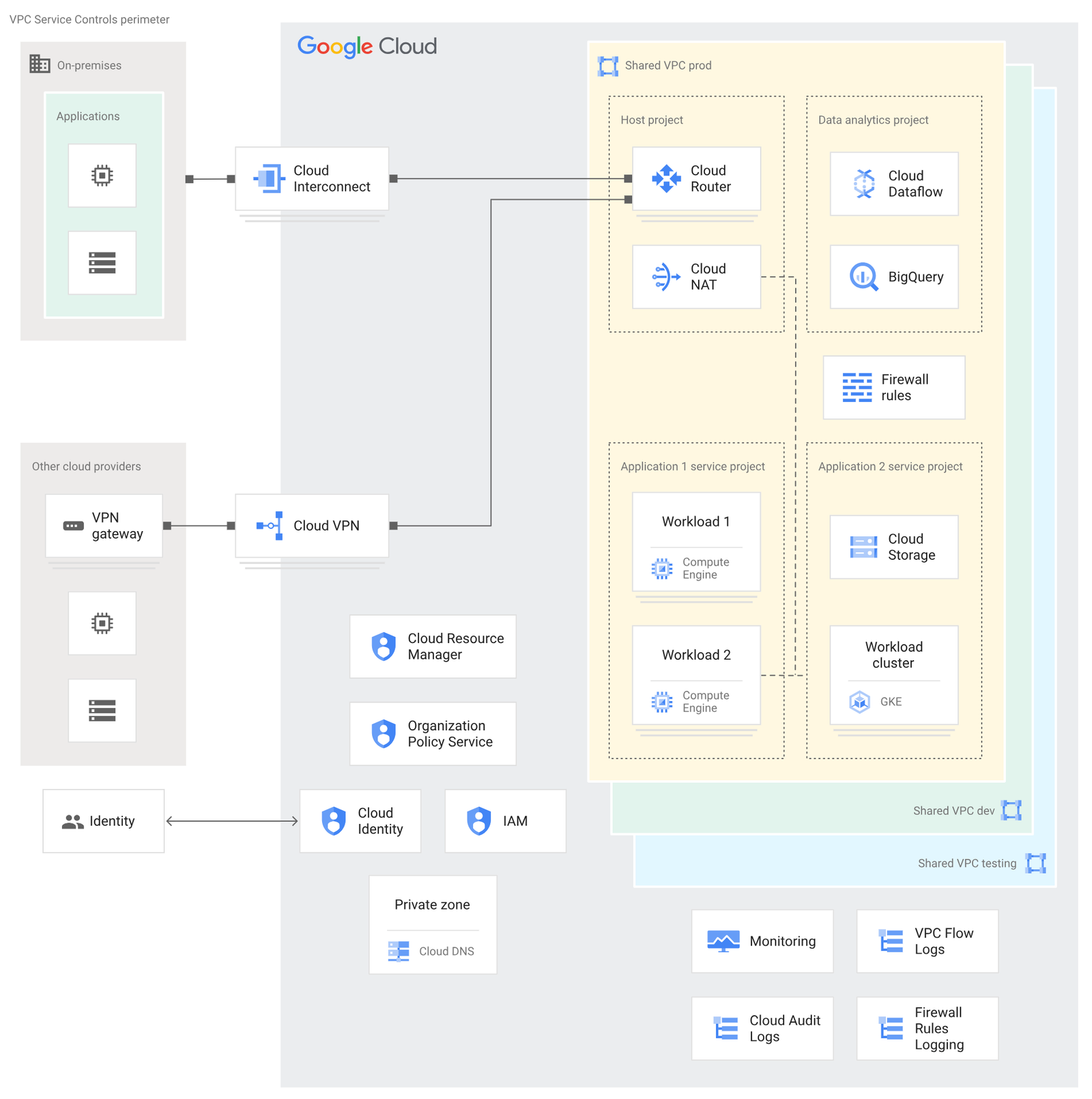 • Shared VPC networks (production, development, testing) connect resources across projects.