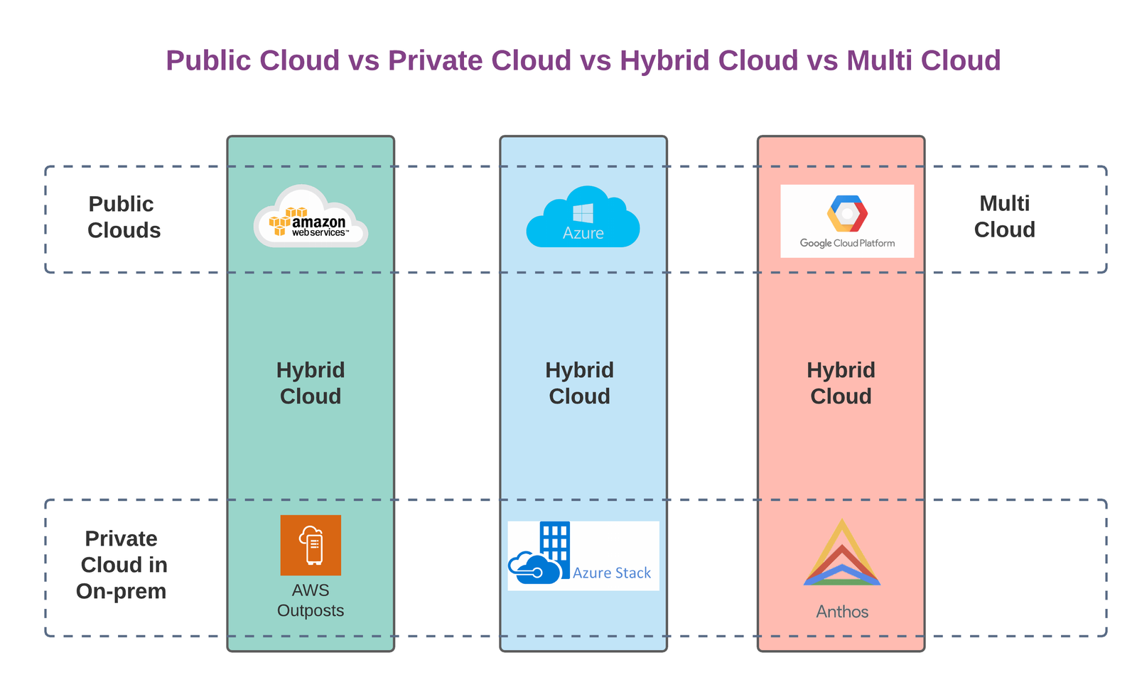 - AWS Outposts, Azure Stack and Google Anthos are the best private cloud examples. They offer fully managed cloud service that offers the same cloud infrastructure, cloud services, APIs, and tools to virtually any datacenter, co-location space, or on-premises facility for a truly consistent private and hybrid cloud experience.