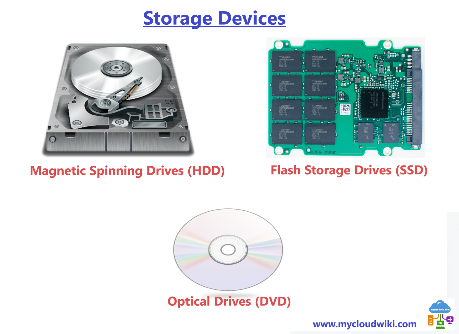 - Magnetic Spinning Drives – Hard disk drive (HDD) and magnetic tape drive.
